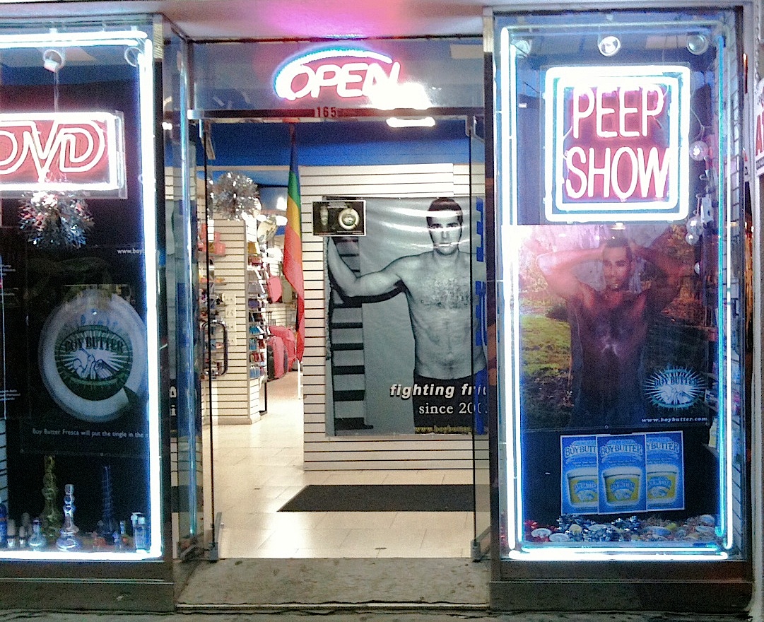 A great new photo taken by Donna Feldman on location in the scenic hills of the Santa Monica mountains in Calabasas, CA has hit the streets of New York City. The new banner is already causing a bit of a stir with the patrons of the Gym bar next door, who always appreciate a new window display to walk by or smoke in front of. The permanent Boy Butter rotating window display at the Blue Dvd adult store in Chelsea is making this sex store just a little bit sexier : )
