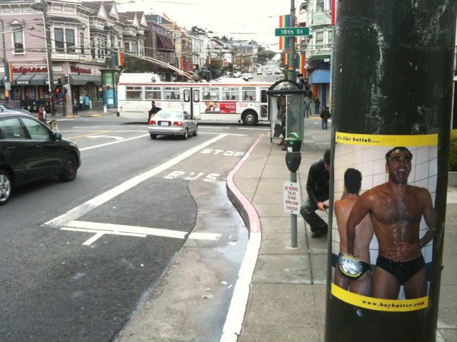 I arrived in San Francisco this weekend for a little R&R and of course a little Boy Butter guerilla marketing. My product is popular in this neck of the woods and you can find the product sold all over SF especially in the famous Castro Street area, arguably one of the gayest places on Earth. When in the Castro neighborhood you can stroll along the area and find Boy Butter lubricants in such shops as Rock Hard, Phantom, Chaps, and even Walgreens, all of them within a 2 block radius. As soon as I arrived I visited stores, shook some hands and postered up the hood. With some of my best Boy Butter posters I snapped some photos of the handiwork of my famed guerilla marketing in key spots of the Castro, check them out here.