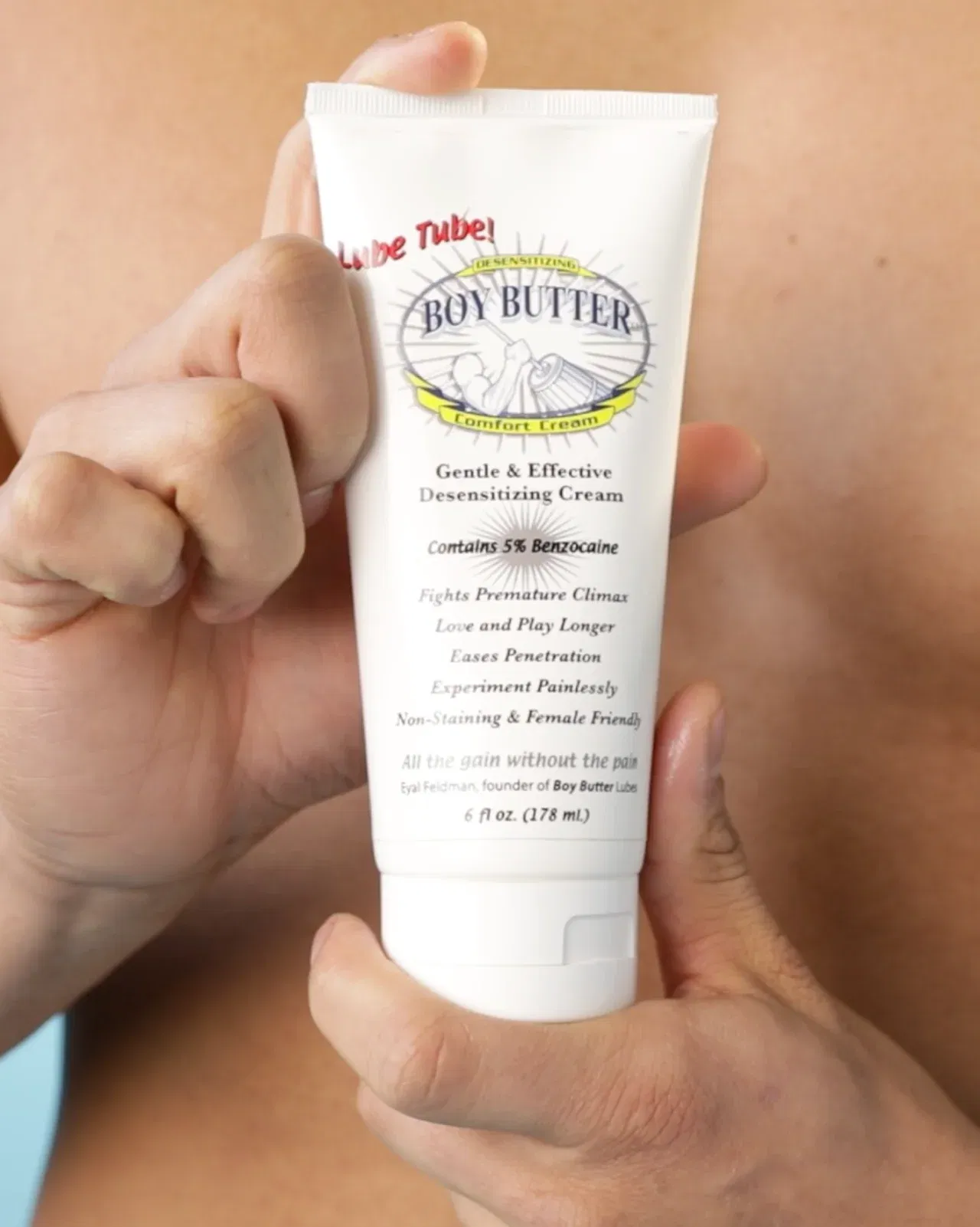 Boy Butter's Comfort Cream is a desensitizing lubricant made with 5% Benzocaine, a local anesthetic. These Ingredients are homogenized like real butter and the end result is a personal lubricant that will numb the fun parts and last as long as any synthetic or silicone lubricant. Mixed into a creamy texture, eliminating the stickiness associated with other lubricants, as long-lasting as silicone lubricants yet washes off with water alone. Better yet, it washes off with water alone, from both skin and fabric.